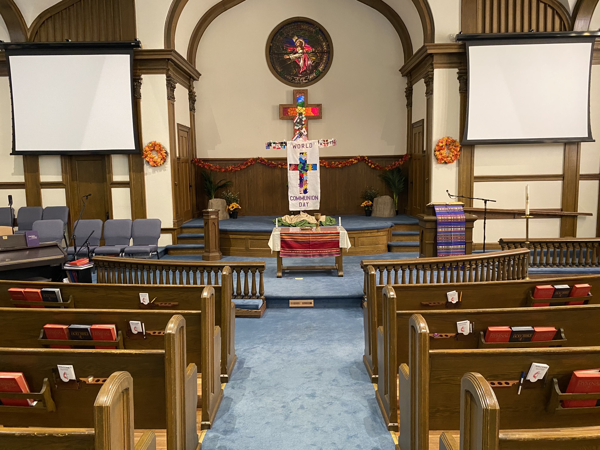 Our beautiful sanctuary is available for weddings and funerals with the approval of the pastor and Church Council. It features a central aisle, “theater-style” seating for improved sight lines, an AV/sound system, and basic livestream capabilities.