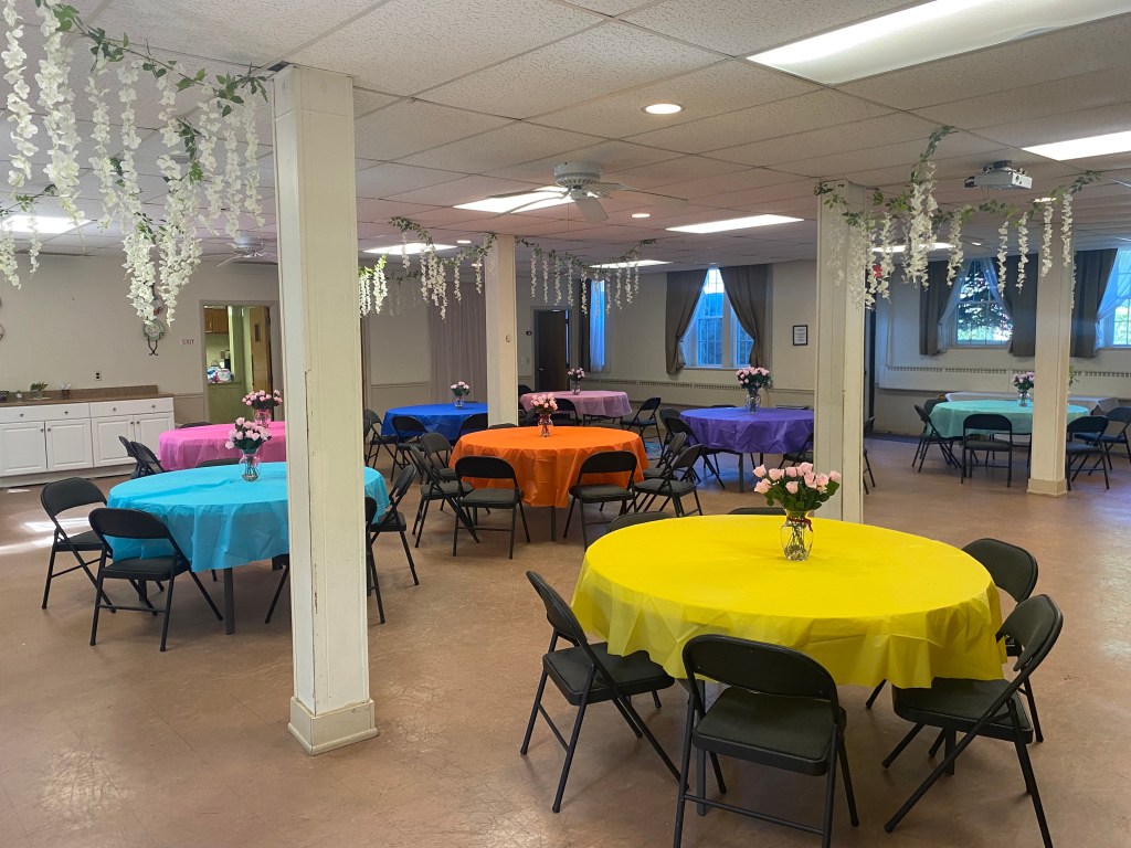 Our fellowship hall, Spargo Hall, is a flexible, multi-use space. It includes a stage; an adjacent kitchen; a sound system; a large, powered screen; and a projector. We have 10 portable 60” round tables and folding chairs available for use. The room can accommodate 90-130 people based on the number of tables and chairs used.